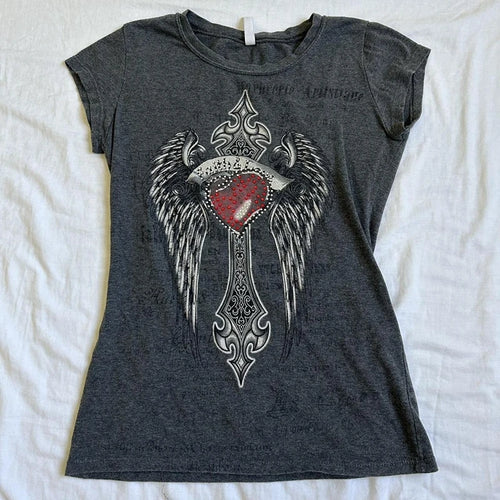 2000s Retro Y2K Cybery Grunge Emo Baby Tees Rhinestone Graphic Print T-shirt Japanese Harajuku Mall Goth Short Sleeve Crop Tops